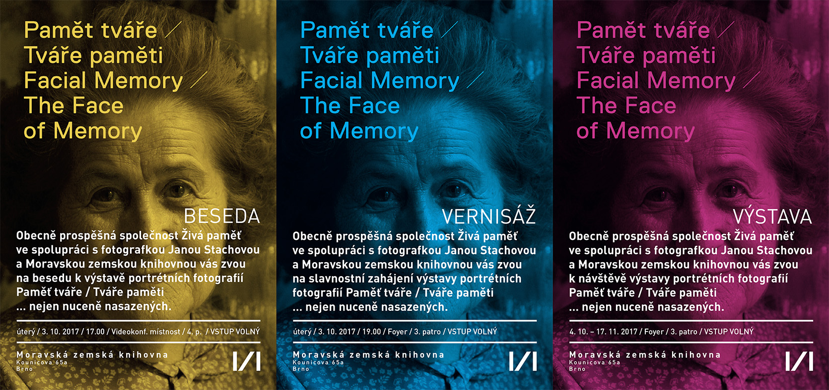 Obecně prospěšná společnost Živá paměť ve spolupráci s fotografkou Janou Stachovou zve na putovní fotografickou výstavu „Paměť tváře / Tváře paměti … nejen nuceně nasazených“o osudech lidí pronásledovaných v období druhé světové války. Výstava se koná s finanční podporou a pod záštitou Ministerstva práce a sociálních věcí České republiky. Partnerem brněnské expozice je Moravská zemská knihovna v Brně. Slavnostní vernisáž se koná v úterý 3. října od 19.00 (Foyer, 3. patro). Naváže na tematickou besedu u kulatého stolu (Videokonferenční místnost, 4. patro, 17.00–19.00). Jejím cílem je zlepšit povědomí veřejnosti o aktuální životní situaci a potřebách této specifické skupiny seniorů.